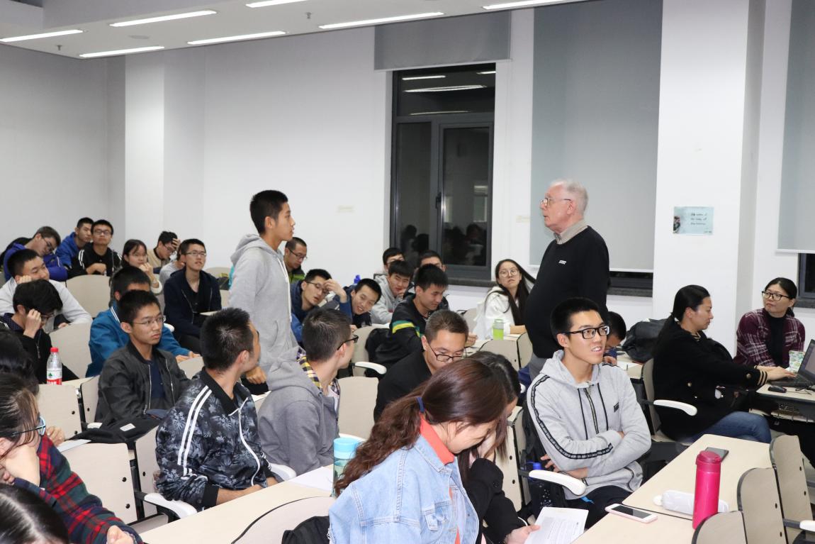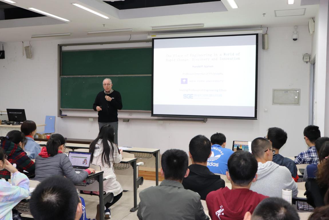Harold P. Sjursen教授现担任国际通用工程学院教授,曾担任纽约大学工程学院的哲学和全球伦理学教授,纽约大学阿布扎比分校和上海分校的附属教职人员,也是上海交通大学的客座讲师。Harold教授为同学们讲解了工程学与科学,创造性思维,革新以及发明之间的紧密联系,通过生活实例的分享让同学们真正认识了解工程学。
