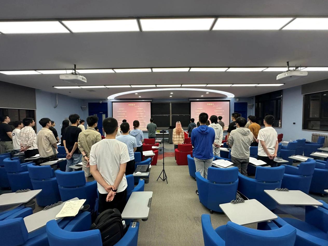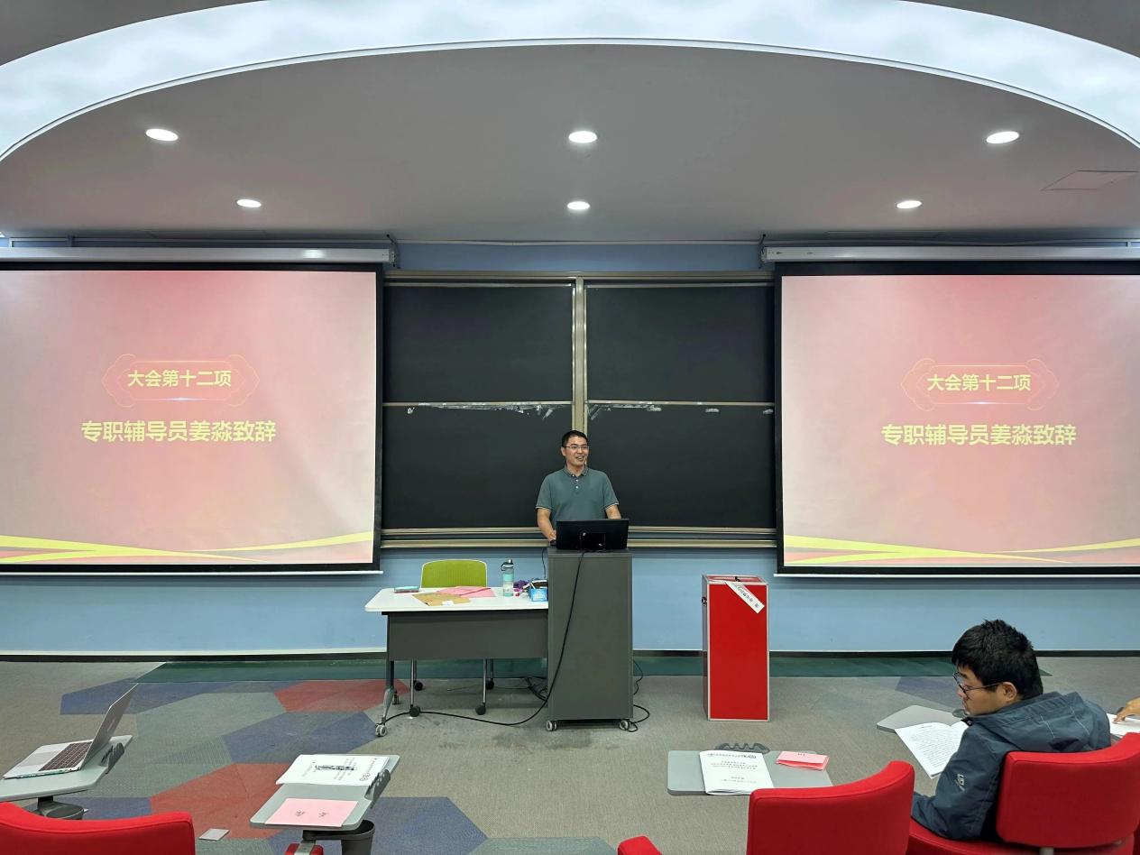 专职辅导员姜淼做总结讲话。他对此次大会的所有组织参与者和学院研究生会的突出工作表示由衷感谢和充分肯定,并对新一届的中法/国通研究生会提出了殷切期许:希望同学们齐心协力,提升服务质量,结合从前的两院特色打造专属活动,相互交流经验,为大家留下美好回忆。最后,全体与会成员合唱校歌《仰望星空》,共同抒发对学院未来发展的美好祝愿和开启研究生会工作的新篇章的期待。