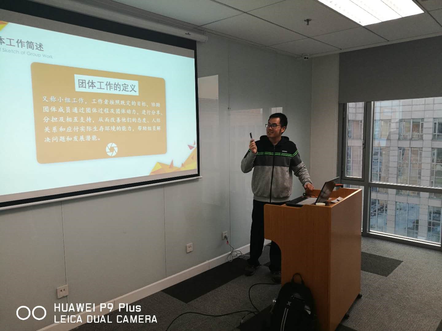 张天淼同学首先为大家讲述了团体工作的相关内容,他指出:“团体工作就是工作者按照既定的目标,协助团体成员通过团体过程及团体动力,进行分享、分担及相互支持,从而改善他们的态度、人际关系和应付实际生存环境的能力,帮助组员解决问题和发展潜能。”张天淼同学同时谈到,我院大一学生正在进行的通用工程导论课项目就是团体工作的一种,希望同学们在合作中提升自己的人际交往能力和沟通合作精神,实现我院培养国际化领军领导人才的目标。