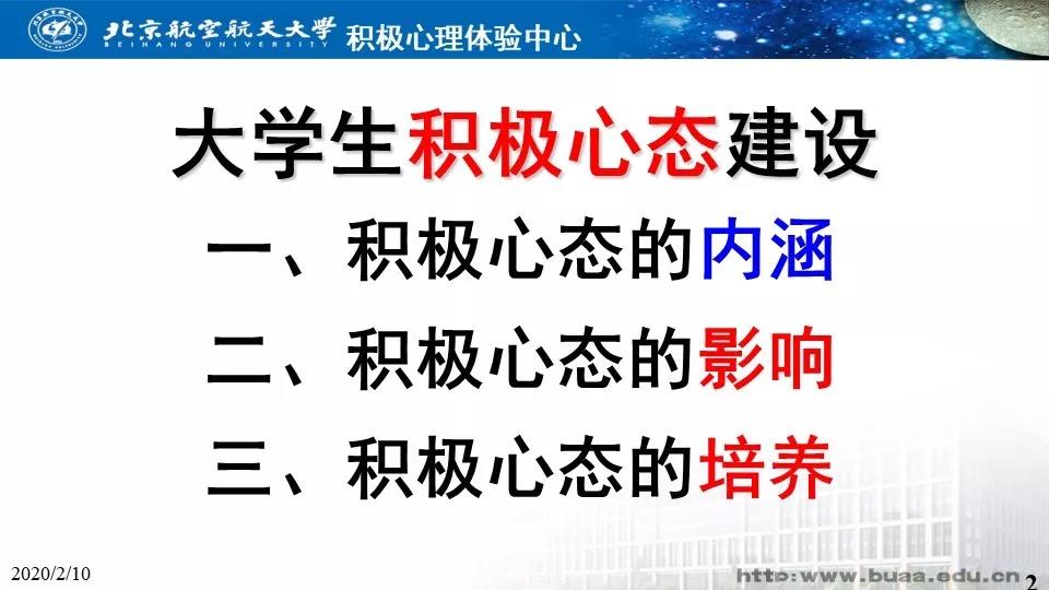2月10日,北航积极心理体验中心主任马喜亭老师受邀进行了主题为“大学生积极心态建设”的心理应激系列讲座直播,现将重点内容整理如下: